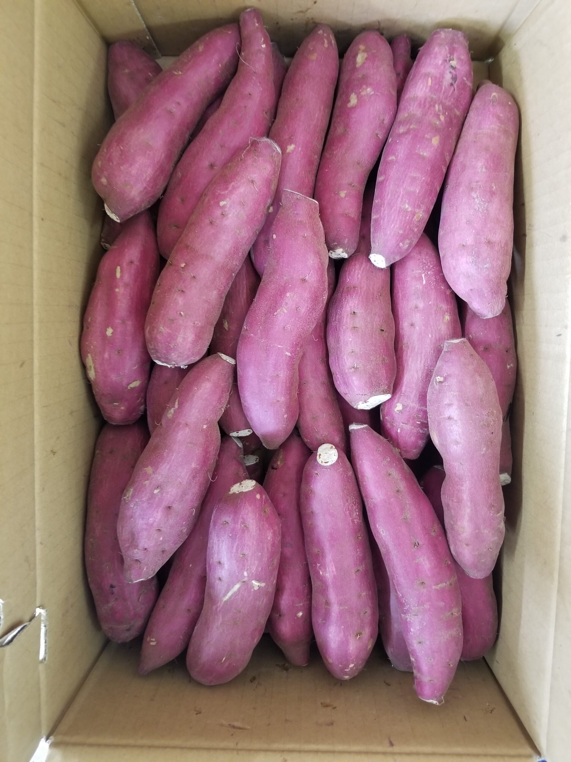 到着後、開封し、大きなダンボールに広げて新聞紙で上を覆って頂き、直射日光の当たらないところ(10度から20度が理想)に置いて頂きますと長期保存が可能になります。(出来れば到着後丸2日お芋を天日干しすると糖熟が進みやすくなります、砂付きで保存してください、洗うのは食べる直前で大丈夫です。